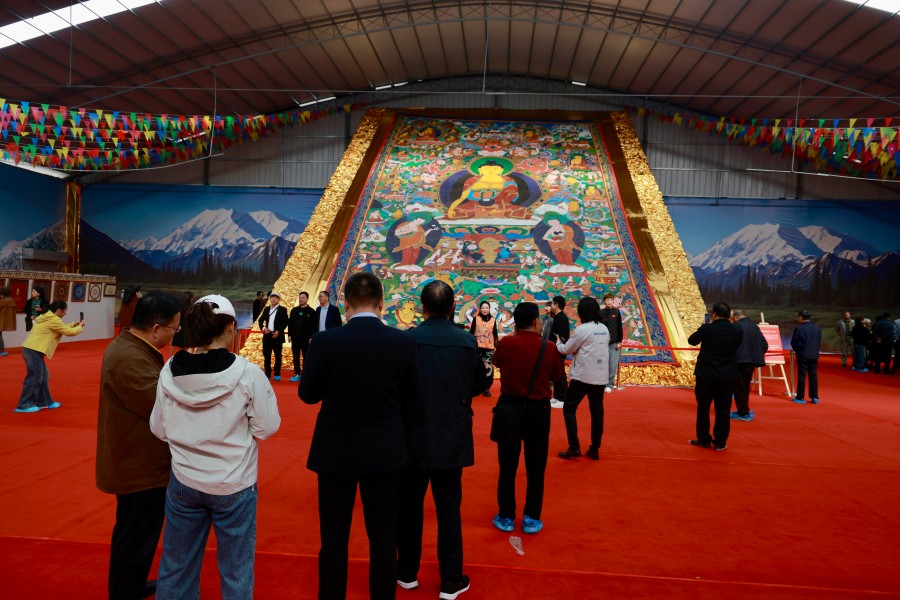 而在非遗展区,一幅融合藏族、汉族等多元民族文化元素的巨型唐卡更是成为全场 “吸睛担当”。唐卡上色彩绚丽的图案、细腻精湛的笔触,将民族文化的独特魅力展现得淋漓尽致,不少观众拿出手机拍照记录,近距离感受非遗技艺的震撼与神奇,直观体会传统文化的传承力量。