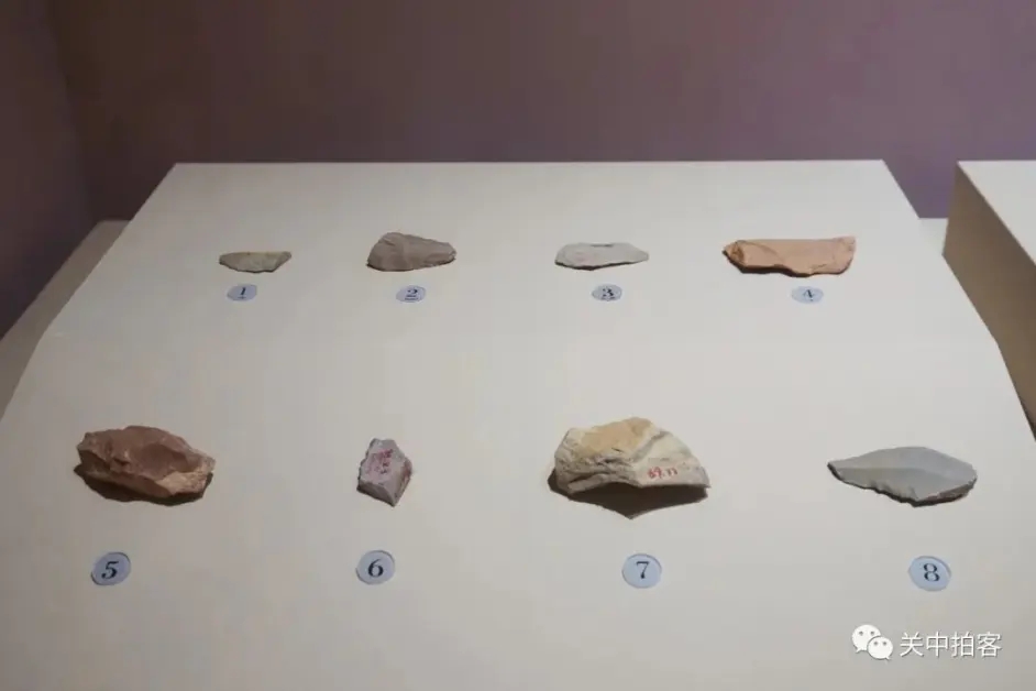 这里展示了一批旧石器时代的石器,包括尖状器、刮削器、石核等类型,出土于宁夏回族自治区灵武市黄河岸边的水洞沟遗址。这里的考古工作开始于1923年,大量古人类的活动遗存被发现,证实了水洞沟是早期现代人在东亚迁徙、扩散和技术交流的重要驻足地,被刘东生先生誉为“中国旧石器考古文艺复兴”的标志。
