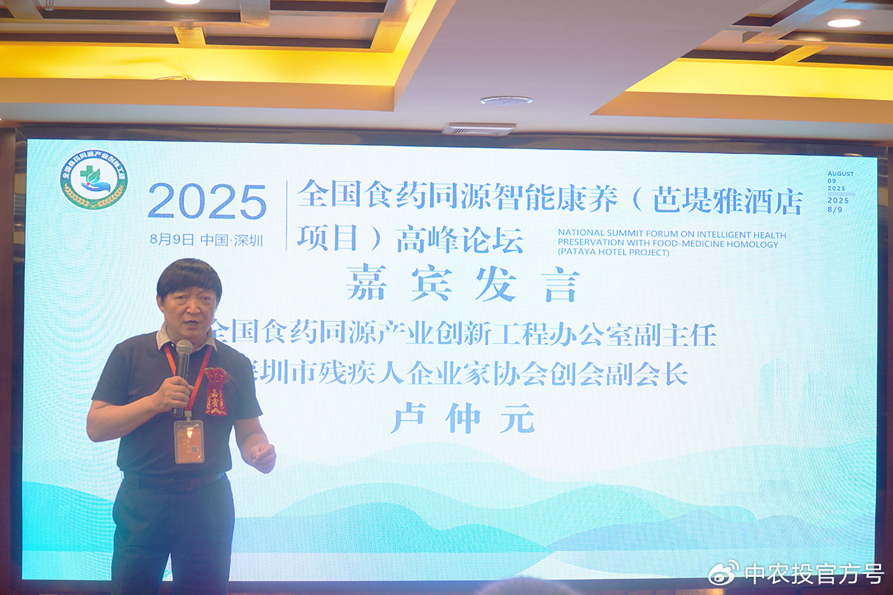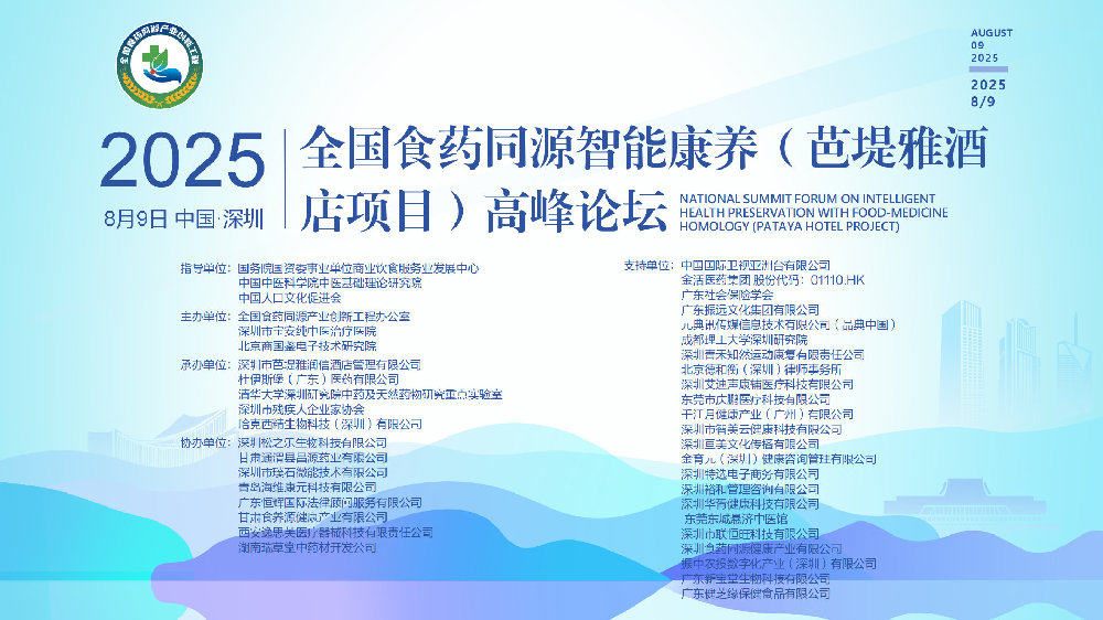 2025年8月9日,全国食药同源智能康养(芭堤雅酒店项目)高峰论坛在深圳市召开。该论坛由国务院国资委事业单位商业饮食服务业发展中心、中国中医科学院中医基础理论研究院、中国人口文化促进会指导,全国食药同源产业创新工程办公室、深圳市宝安纯中医治疗医院、北京商国鉴电子技术研究院联合主办,深圳市芭堤雅润信酒店管理有限公司、哈克西精生物科技(深圳)有限公司、杜伊斯堡(广东)医药科技有限公司、清华大学深圳研究院中药及天然药物研究重点实验室、深圳市残疾人企业家协会共同承办。